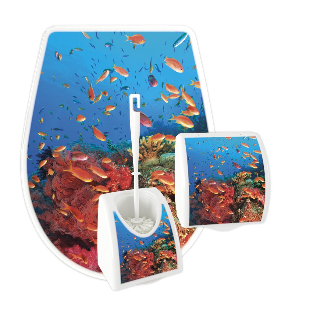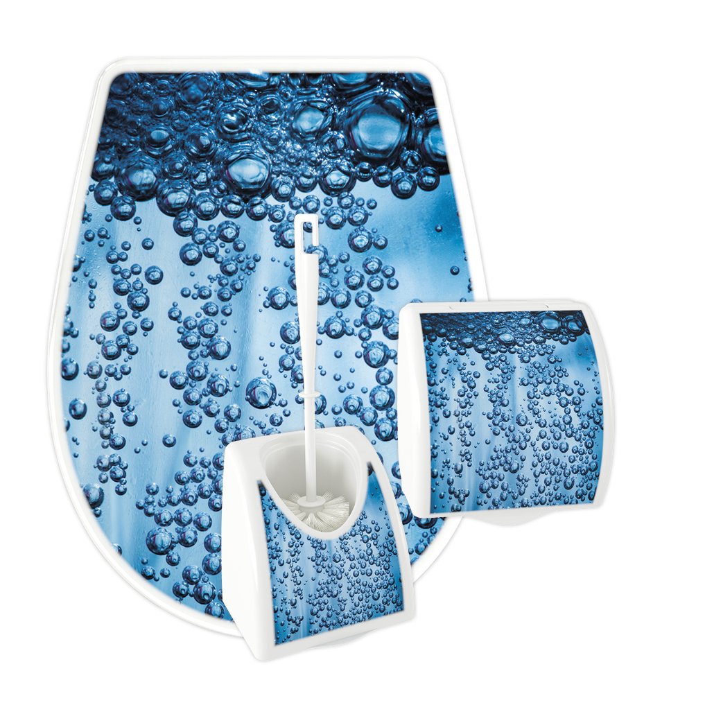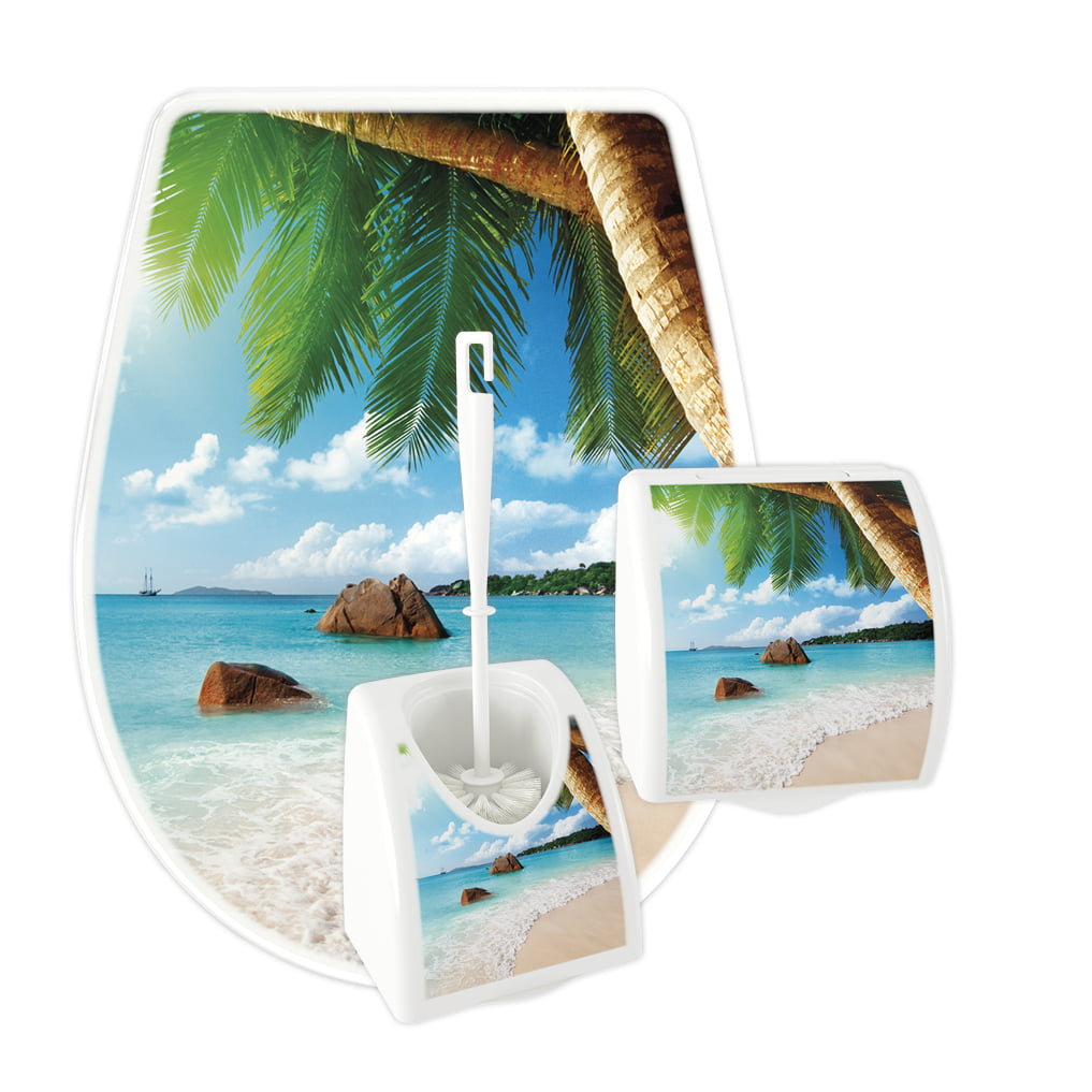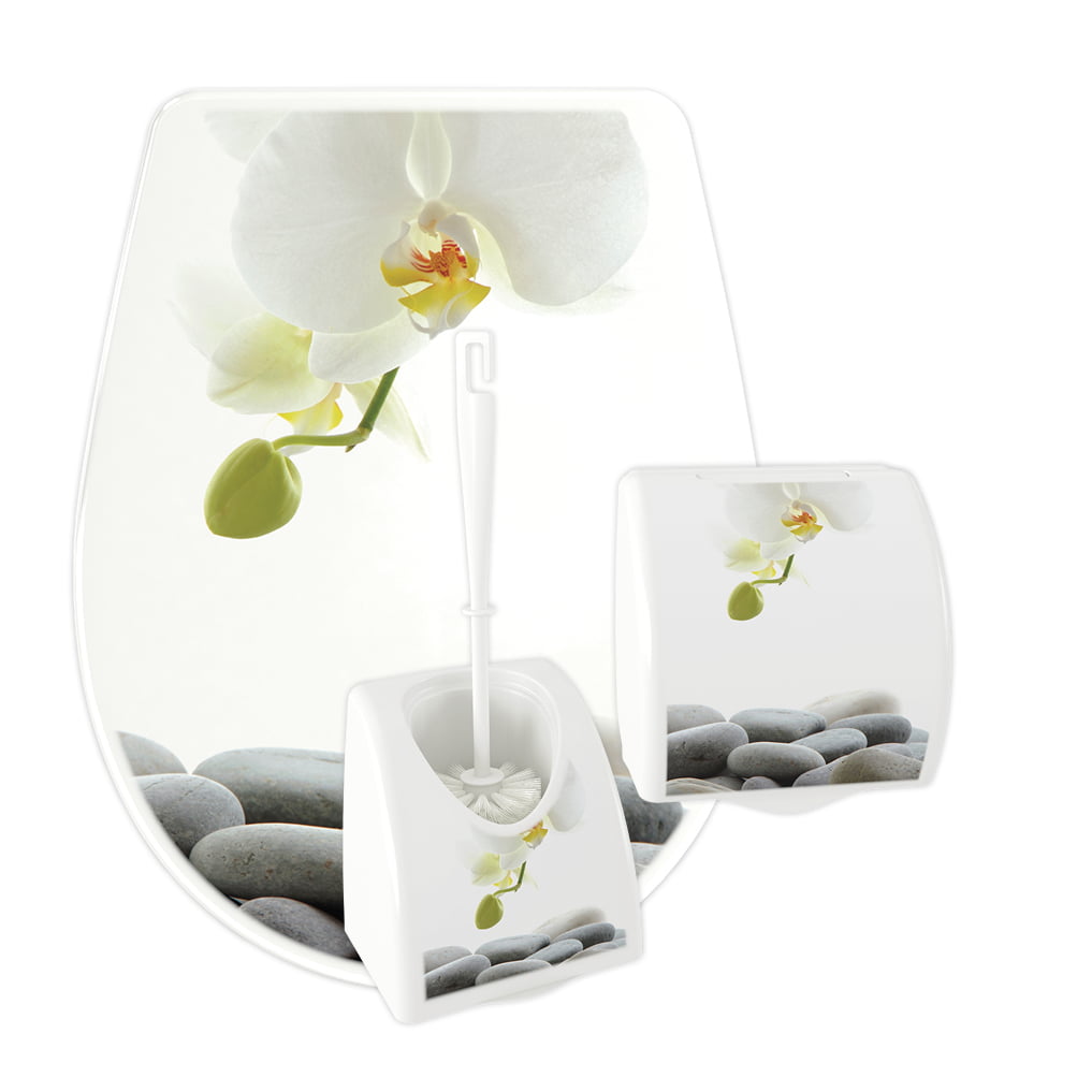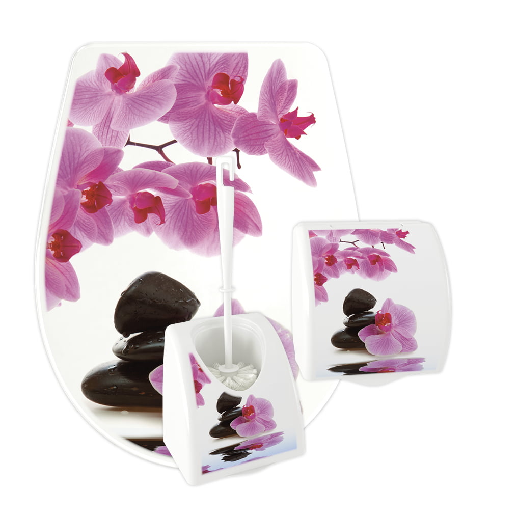 3 -częściowy komplet łazienkowy CLEO wykonany z polipropylenu z nadrukiem IML. W skład kompletu wchodzi deska sedesowa o uniwersalnym kształcie, który pasuje do wielu standardowych ceramik sanitarnych dostępnych na rynku, zawieszka na papier toaletowy oraz pojemnik i szczotka WC. Do wyboru jest 13 różnych wzorów etykiet.