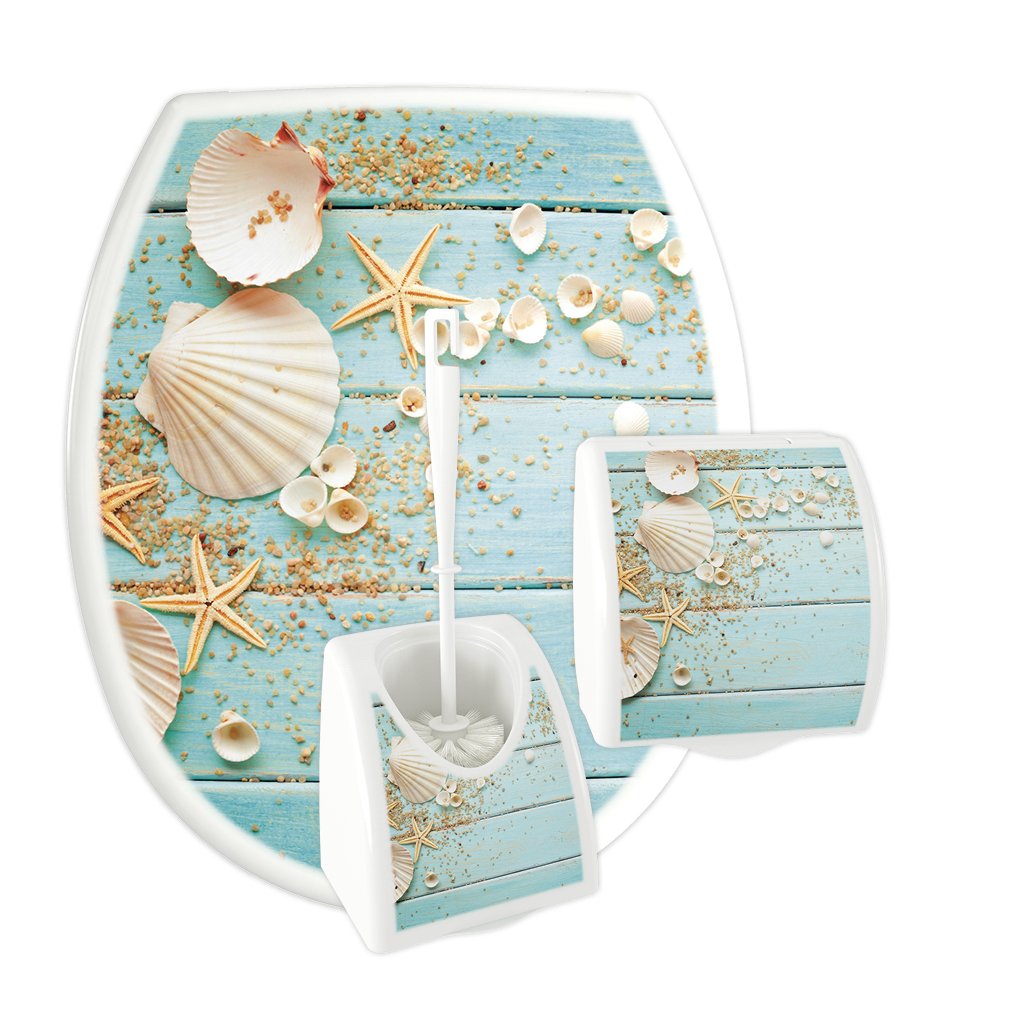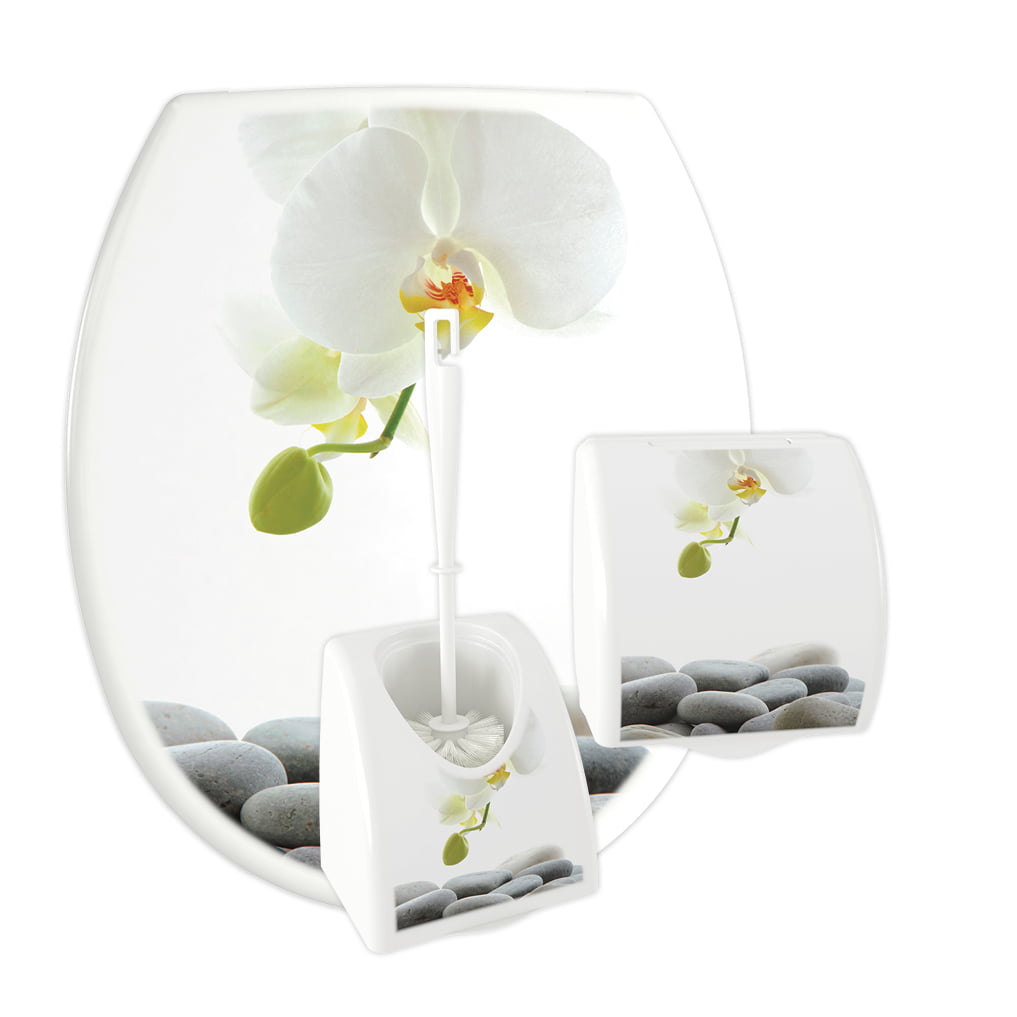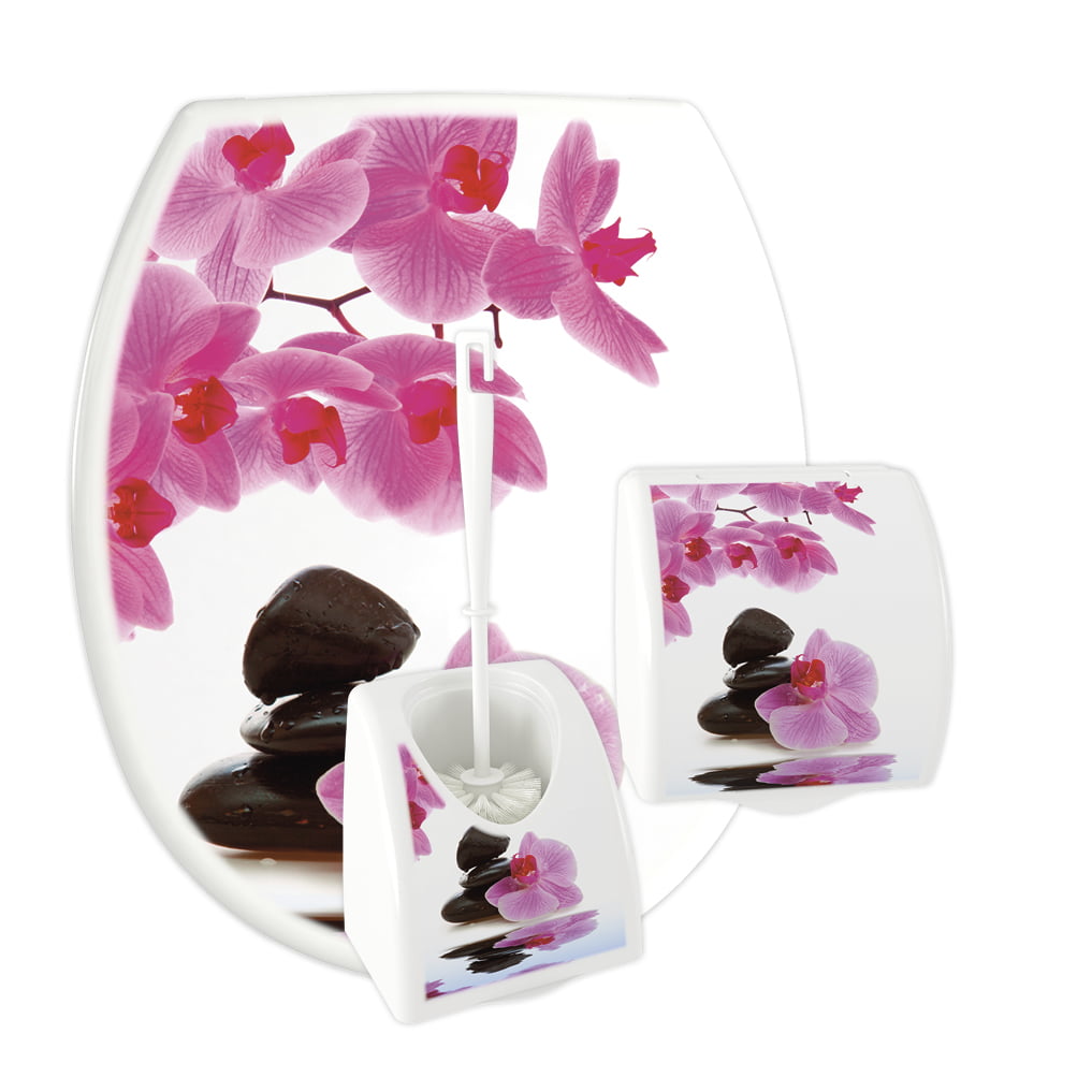 3 -częściowy komplet łazienkowy KASKADA wykonany z polipropylenu z nadrukiem IML. W skład kompletu wchodzi deska sedesowa o uniwersalnym kształcie, który pasuje do wielu standardowych ceramik sanitarnych dostępnych na rynku, zawieszka na papier toaletowy oraz pojemnik i szczotka WC. Do wyboru jest 13 różnych wzorów etykiet.