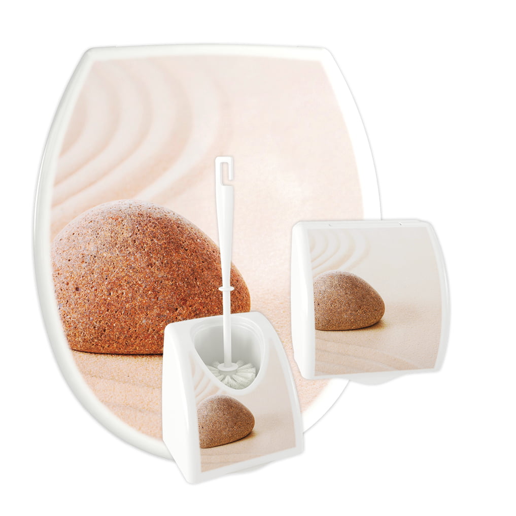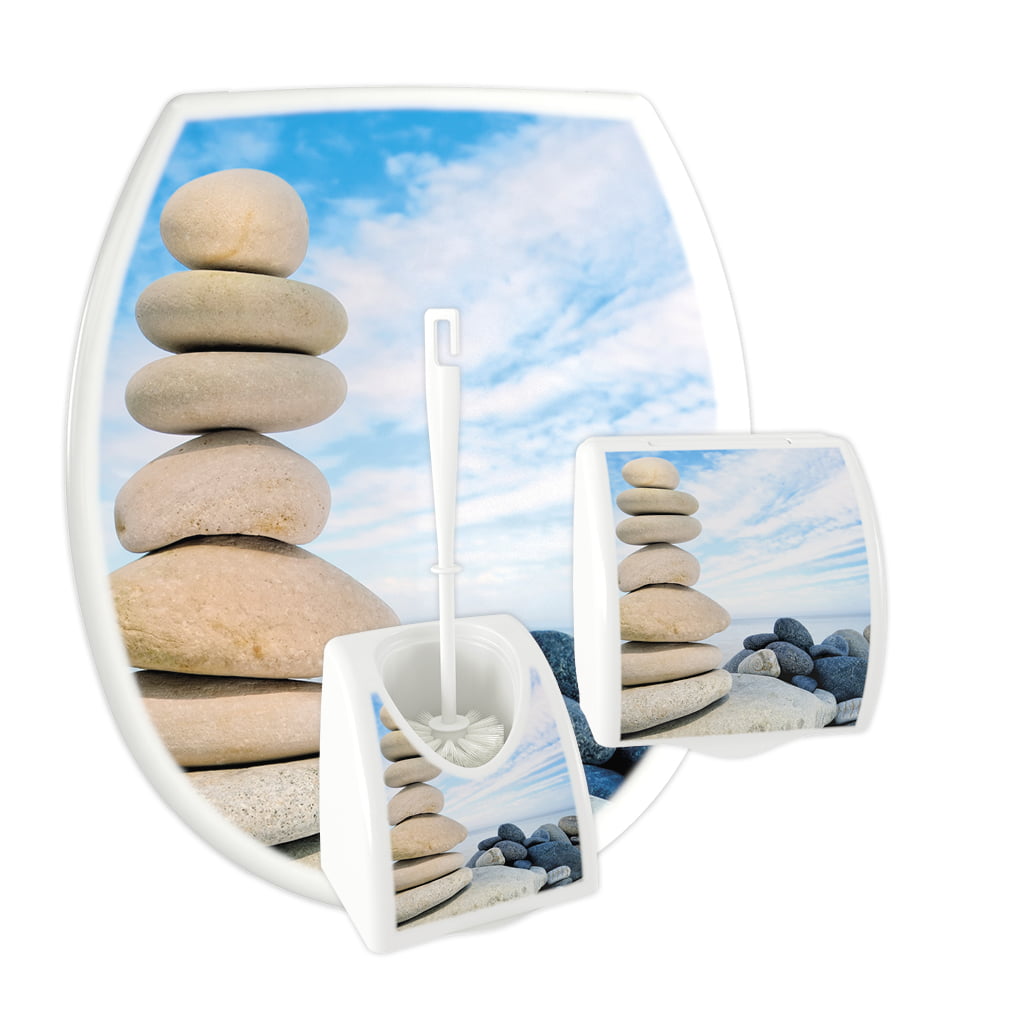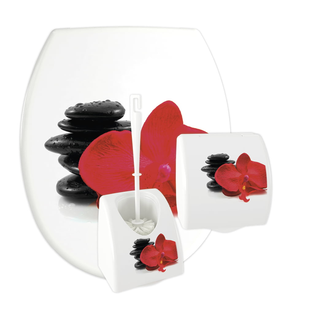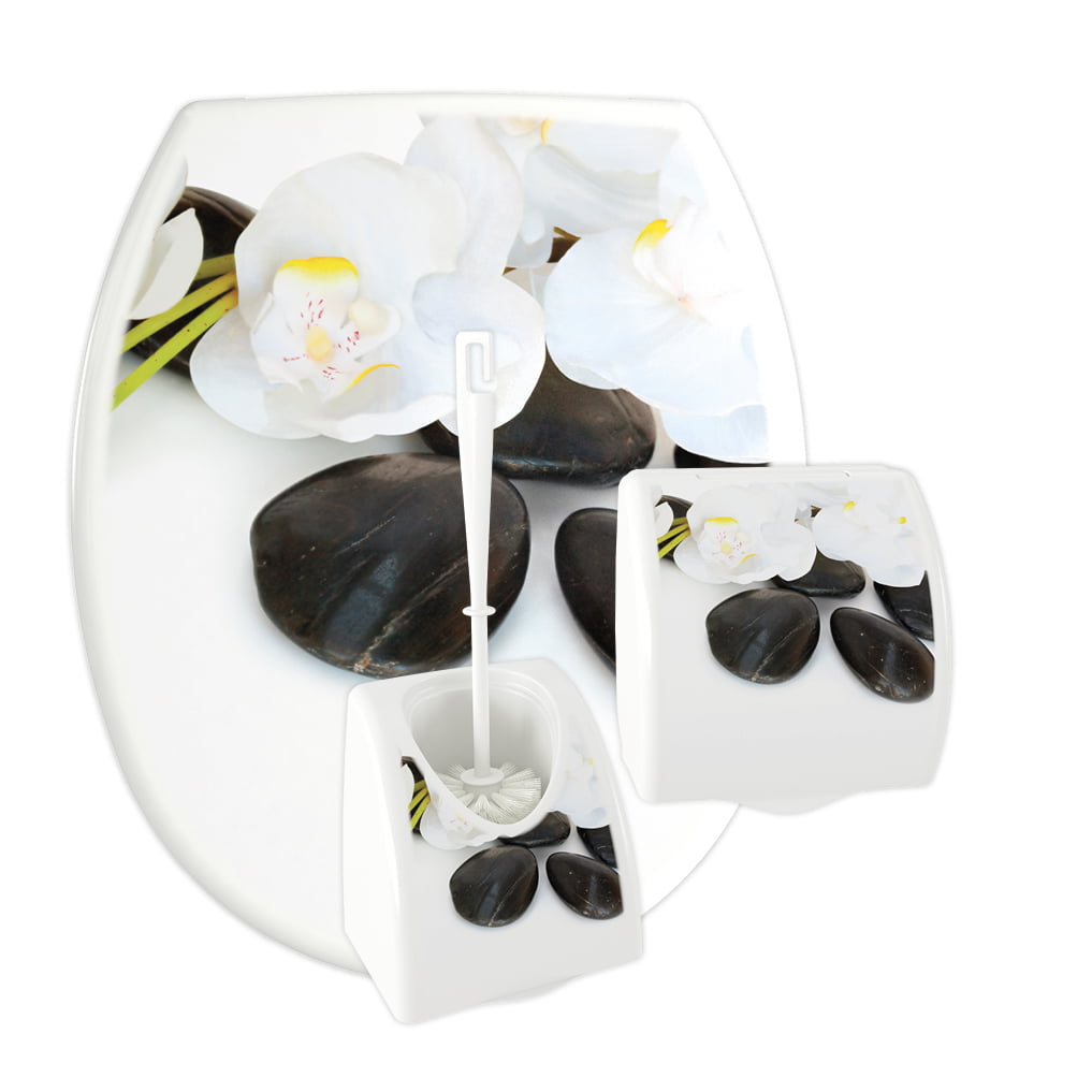 3 -częściowy komplet łazienkowy KASKADA wykonany z polipropylenu z nadrukiem IML. W skład kompletu wchodzi deska sedesowa o uniwersalnym kształcie, który pasuje do wielu standardowych ceramik sanitarnych dostępnych na rynku, zawieszka na papier toaletowy oraz pojemnik i szczotka WC. Do wyboru jest 13 różnych wzorów etykiet.